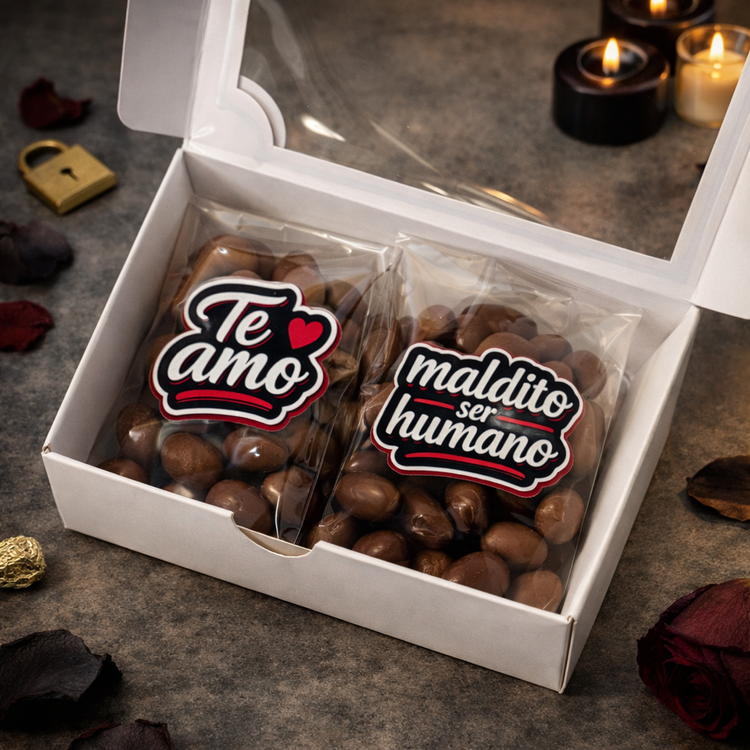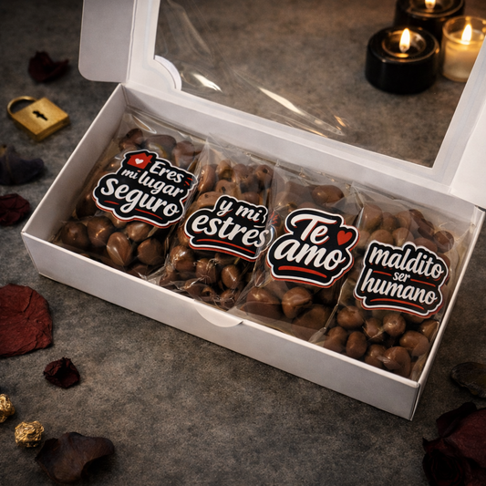 Caja San Valentín Anticursi - Frutos Secos con Chocolate y Stickers Honestos | Regalo 14 Febrero para Parejas Reales
