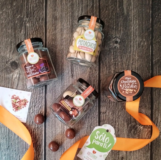 Este pack contiene 4 frascos de vidrio, dentro de una caja decorada con cinta de tela y Tag. Contempla una tarjeta con un mensaje personalizado de tu parte.