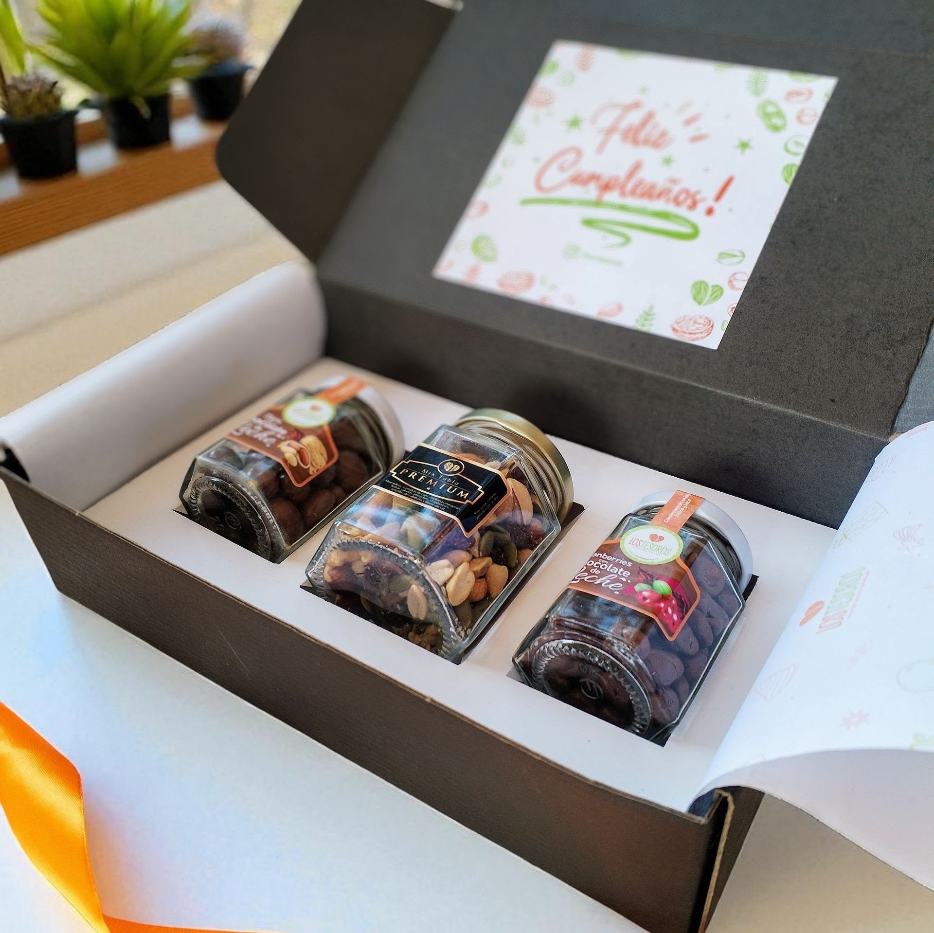 Nuestra Caja Negra Tres Delicias incluye tres frascos de vidrio cuidadosamente presentados en troquel, dentro de una elegante caja negra. Un detalle premium, ideal para regalar.