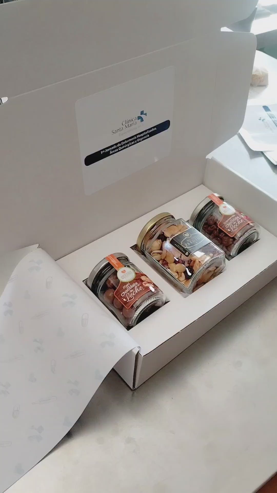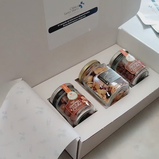 Esta elegante caja incluye tres frascos de frutos secos y chocolates, más un estuche de lino personalizable con frase y logo, creando un detalle útil, memorable y perfecto para clínicas, centros médicos y empresas del área salud.