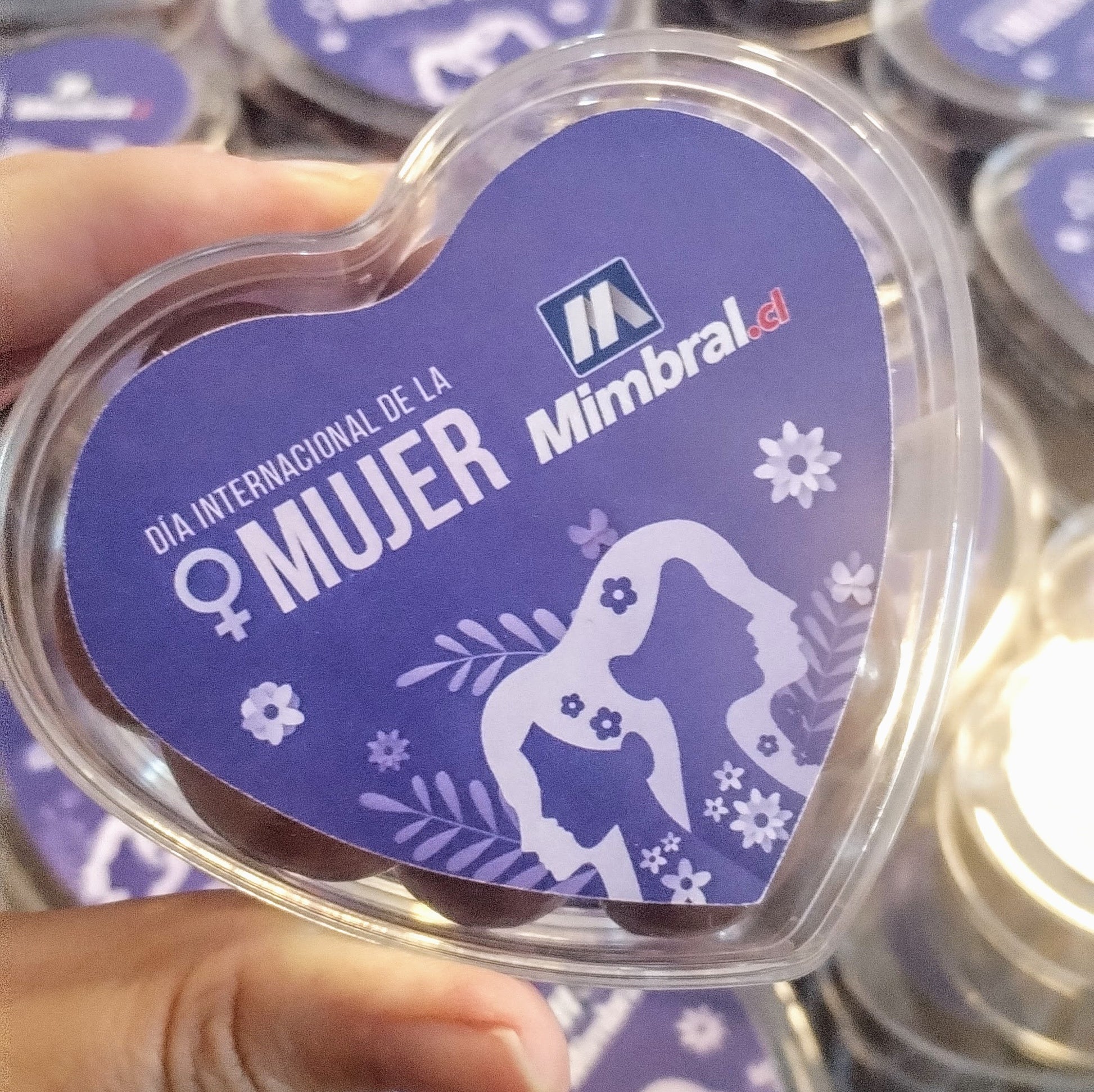 Una cajita corazón de acrílico transparente personalizada con el nombre de cada mujer + 80 gramos de cranberries bañados en chocolate de leche 35% cacao. Un reconocimiento Día Internacional de la Mujer que dice "te vemos, te valoramos, eres importante".