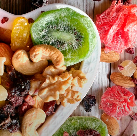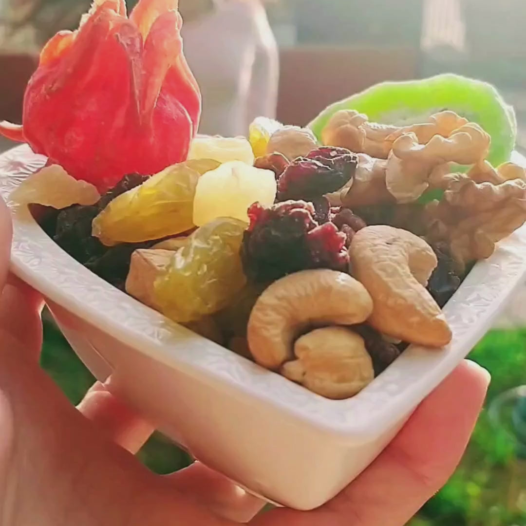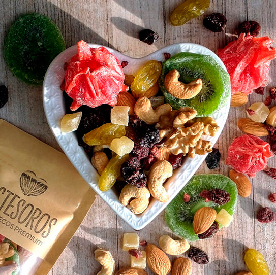 Combina almendras enteras, castañas de cajú sin sal, cranberries, lonjas de kiwi, nueces, pasas rubias y negras, flor de hibisco y piña en cubos. La flor de hibisco aporta un sabor agridulce refrescante y es rica en antioxidantes, vitamina C y minerales.