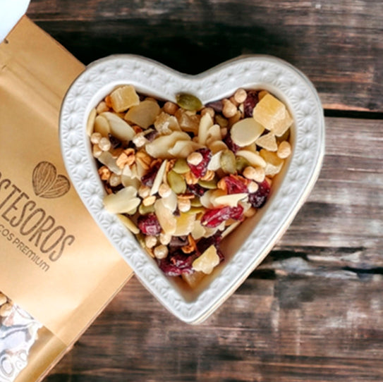 Este mix tiene quínoa pop natural, granola (avena miel), semillas de calabaza, cranberries, piña en cubos, almendras laminadas y chips de chocolate 63% cacao, vegano.