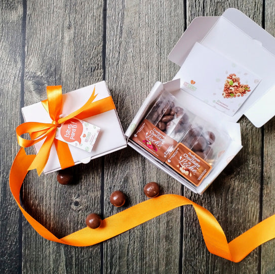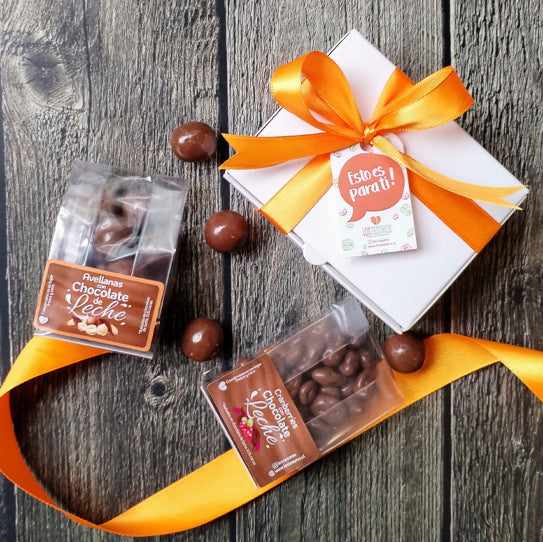 Este Pack Regalo Mini contiene 2 sachets con 50 gr cada uno de productos bañados en chocolate de leche. El de la foto, como referencia, contiene:
